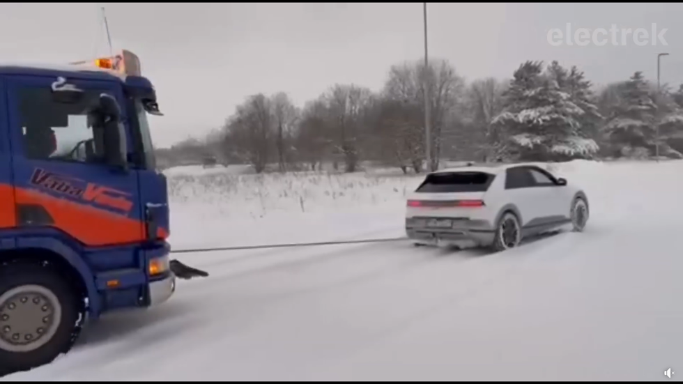Estonie: Une Hyundai Ioniq 5 remorque un camion plateau